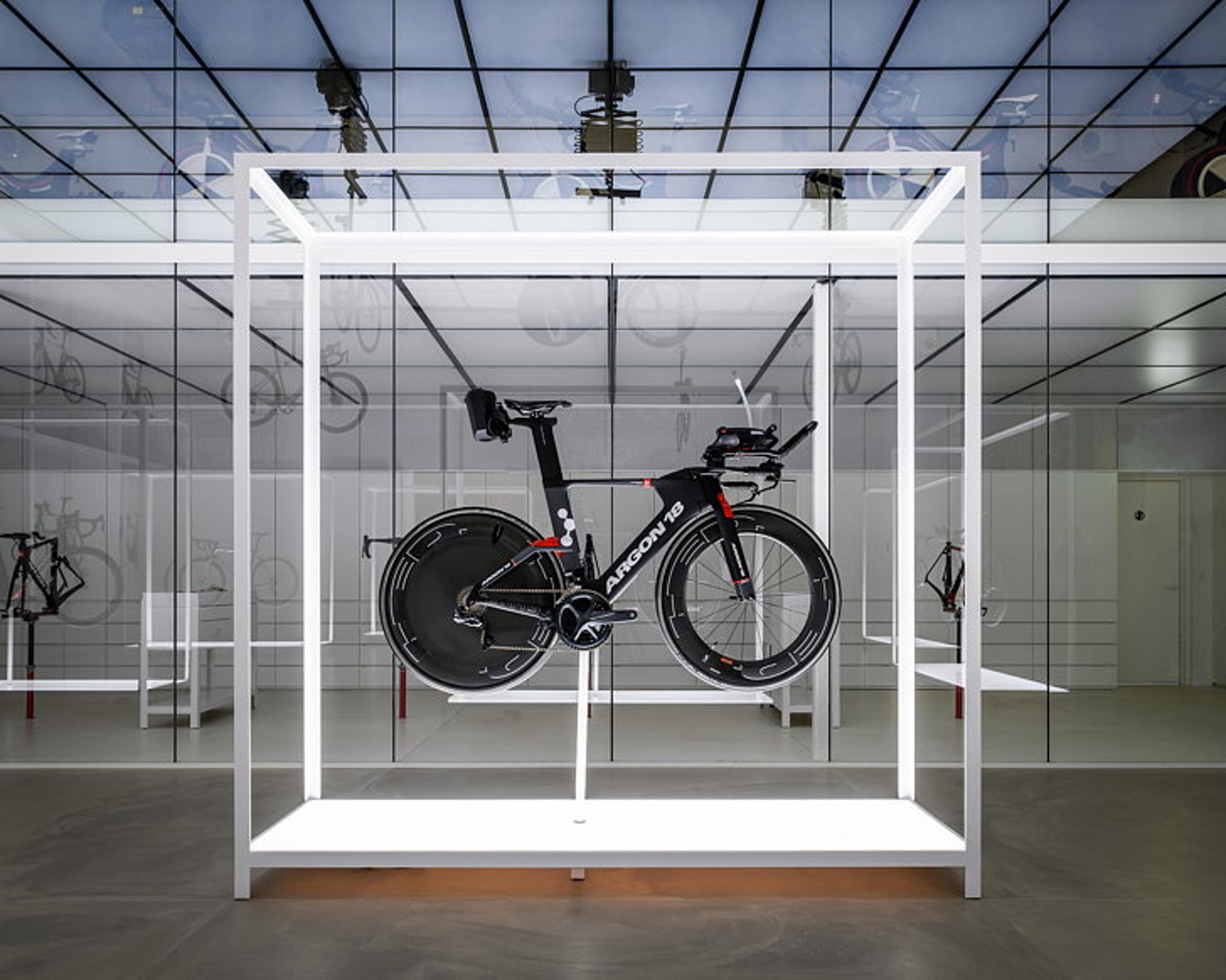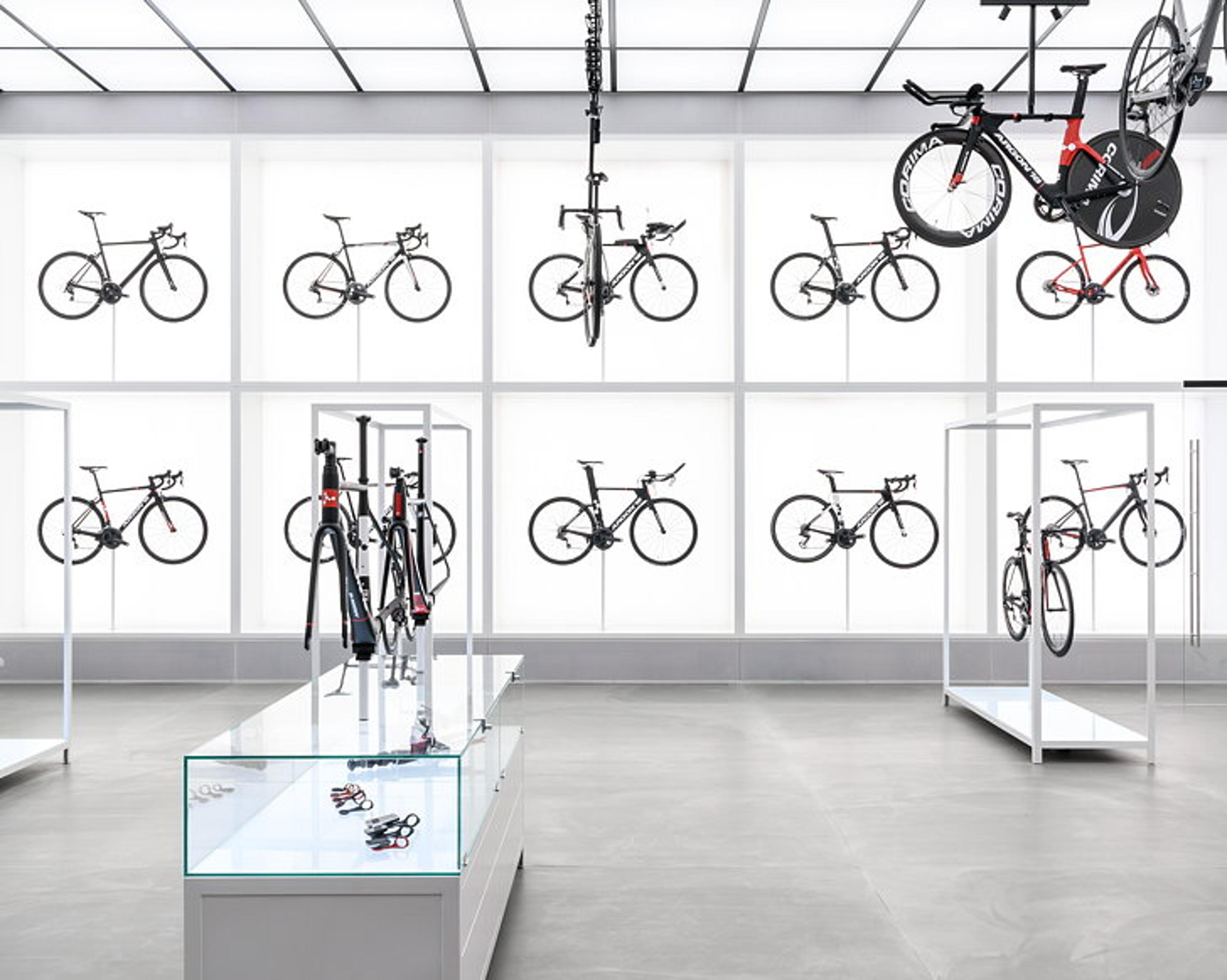 The showroom is designed to elevate the bicycles and display their sovereignty. All elements in the showroom and the product gallery follow the same gridlines. The combination of precision and the very technical products on display creates a clinical yet ethereal atmosphere – almost like entering a sci-fi laboratory.