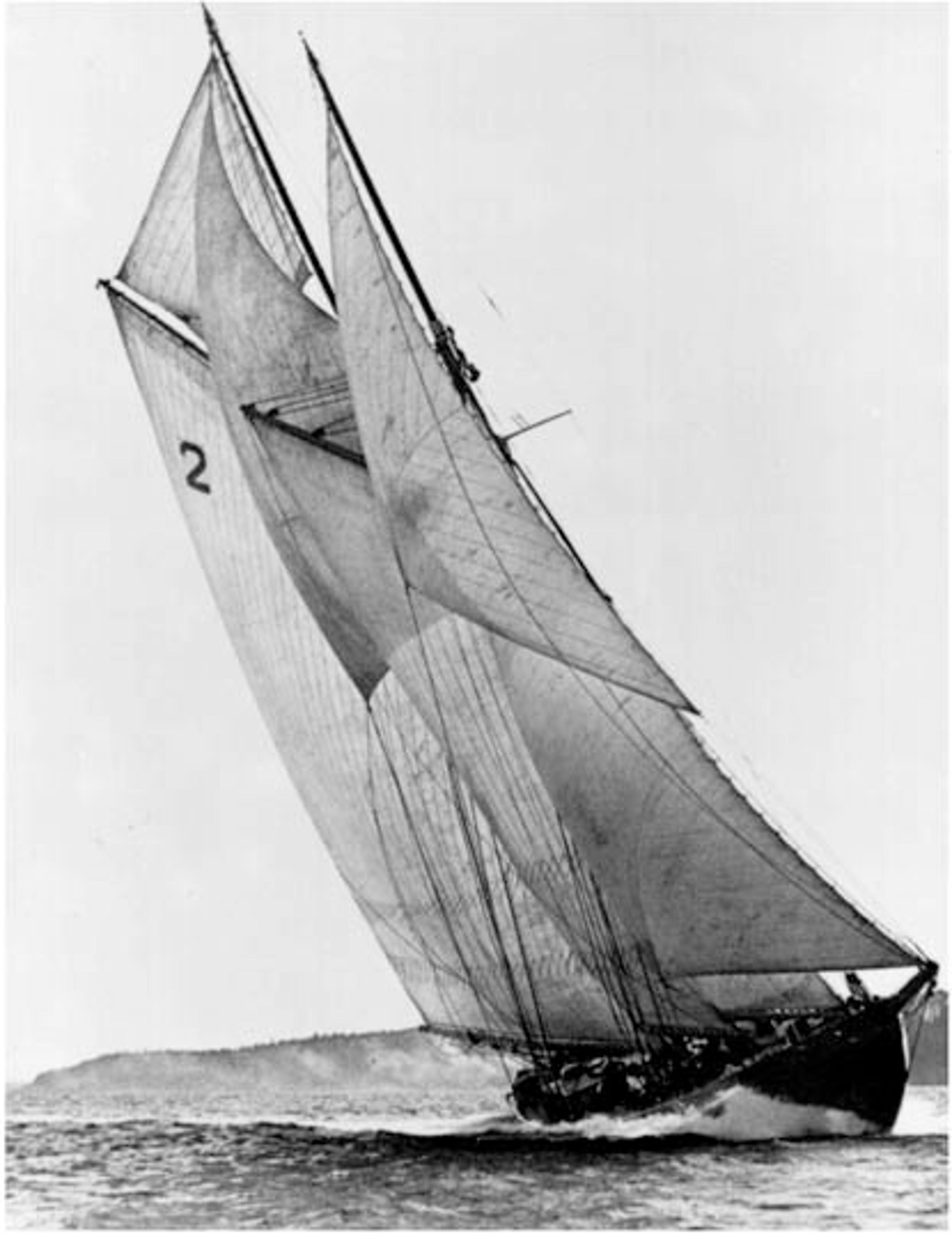 The Canadian fishing schooner, Bluenose (The name “bluenose” originated as a nick-name for Nova Scotians from as early as the late eighteenth century), was built in 1920-21, at Lunenburg, Nova Scotia, by Messrs. Smith and Rhuland, to the designs of W. J. Roué, of Halifax, and launched in March, 1921. Essentially a practical fishing boat, the schooner was also designed to uphold the Bluenose racing supremacy on the Atlantic seaboard. That she achieved her promoters’ ambition is proved by the fact that she decisively defeated every competitor of her class. She never lost a race. The owners of the Bluenose were honoured in 1935 by having their schooner present when King George V reviewed the British Fleet at Spithead.