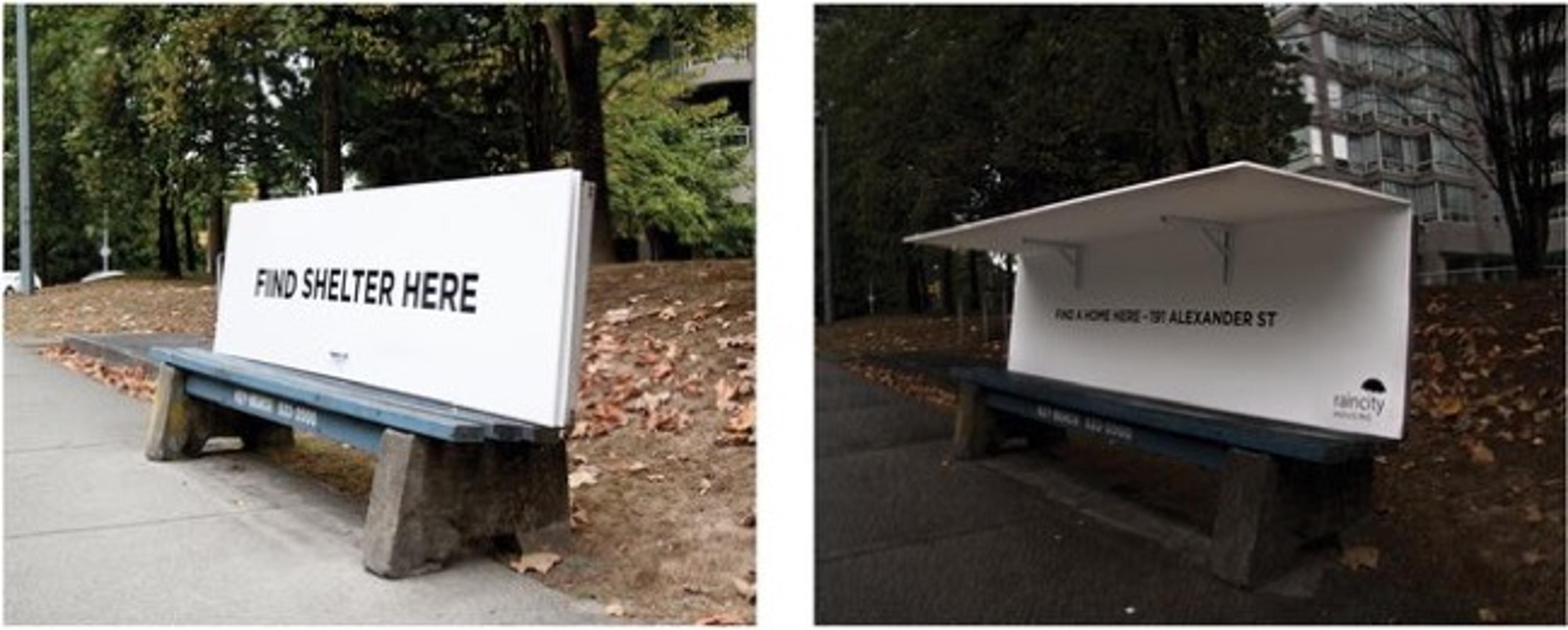 > RainCity Housing provides specialized housing and support services for the homeless. To help communicate this, we created a transit bench that transforms into a temporary shelter for those in desperate need. When the roof is up, Rain City’s housing address is posted on the inside along with the message, “Find a home here.”