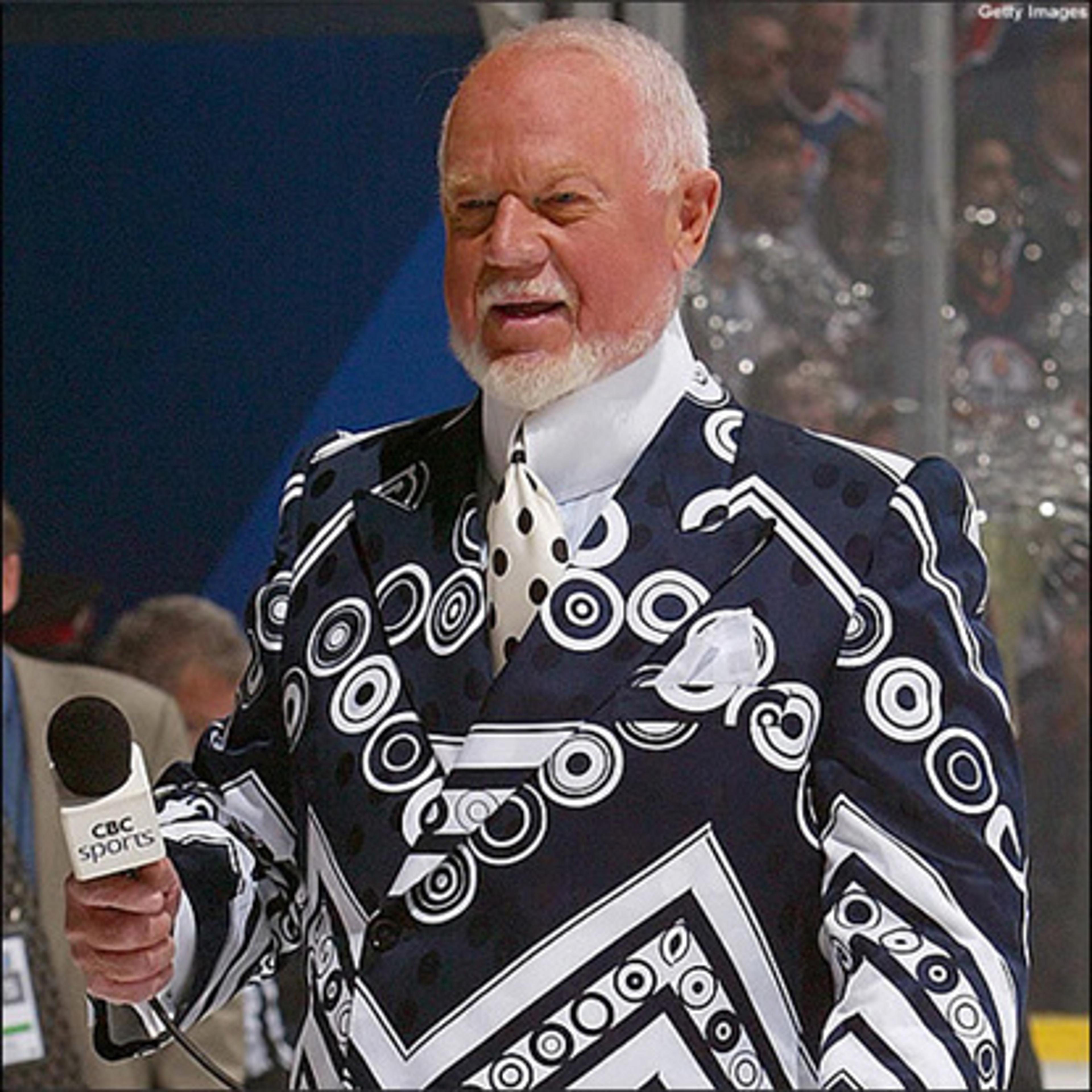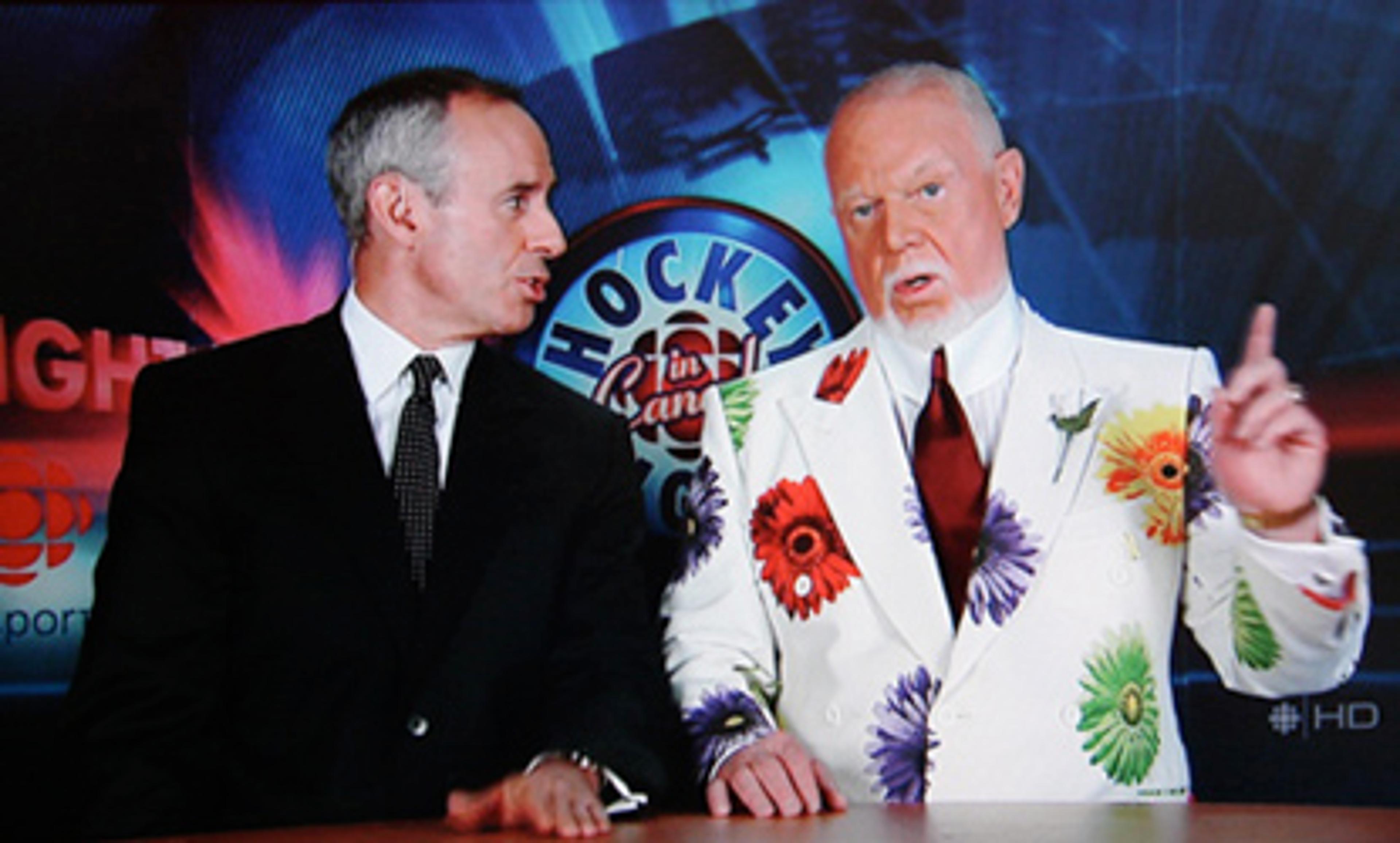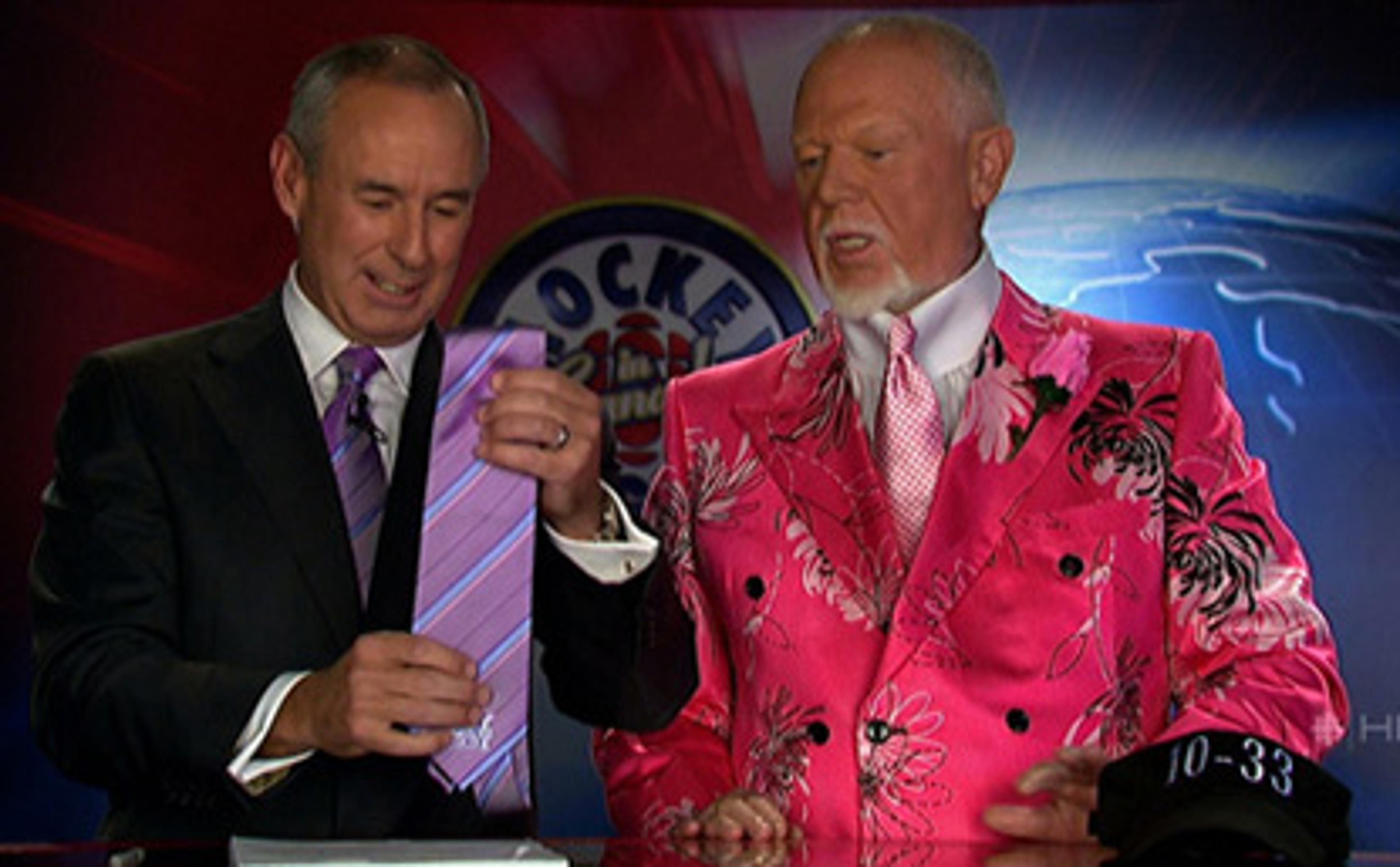 “You told me to wear pink! This tie is lavender!” Don Cherry, the most daring dresser in Canadian television, probably, let alone in hockey, wore pink…in support of a cure for breast cancer. Cherry, the hockey commentator whose fractious half-time show, Coach’s Corner, is a strange Canadian institution, is here complaining to his ironic sidekick Ron MacLean that the NHL’s designated breast cancer tie is lavender, not pink, and that it doesn’t really match the properly pink ensemble he’d asked his tailor make for the occasion. Cherry, whose views on most topics can hardly be considered progressive (that’s an understatement), has at least never been worried about conforming to the rules of masculinity, or to anything else for that matter. How often do tough guys mix stiff Edwardian collars with hot pink carnations? Or daisies, or chrysanthemums, or… all the other flowers. I’m not a hockey fan, or a loudmouth fan, but Don Cherry’s sartorial experimentalism is the utmost. His longtime tailor, Frank Cosco, died last year, and his son is now having to deal with Cherry’s finicky requests.