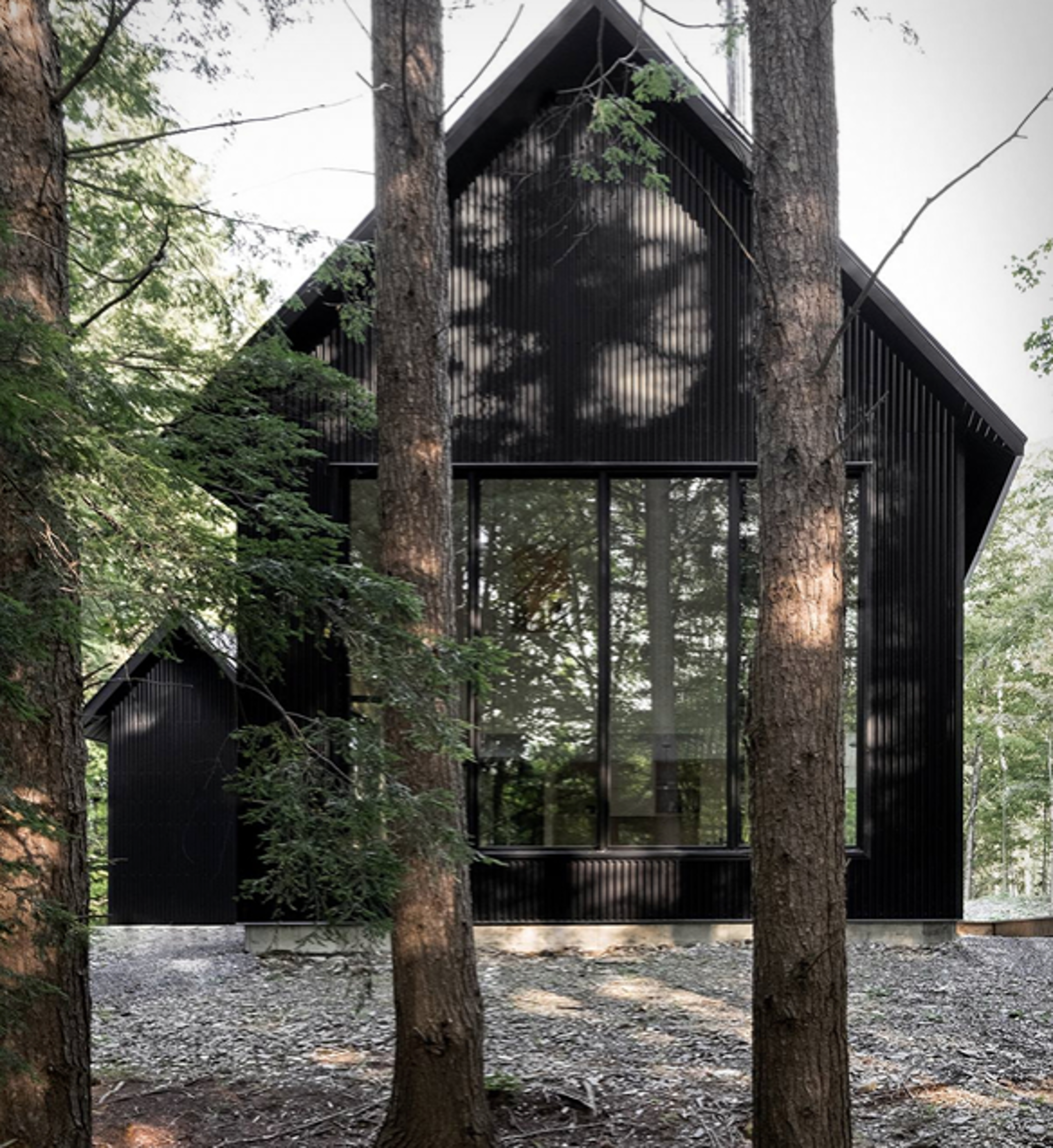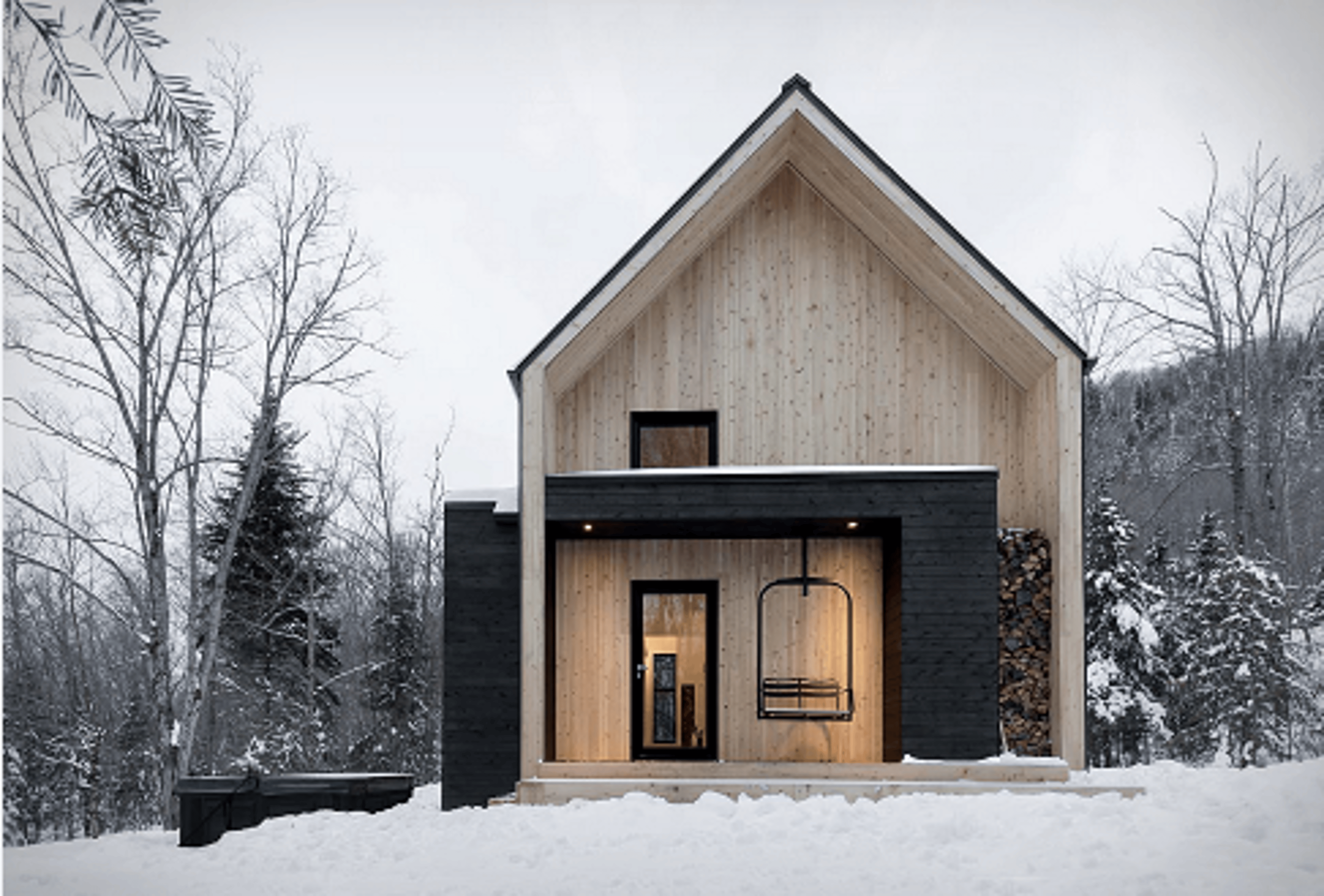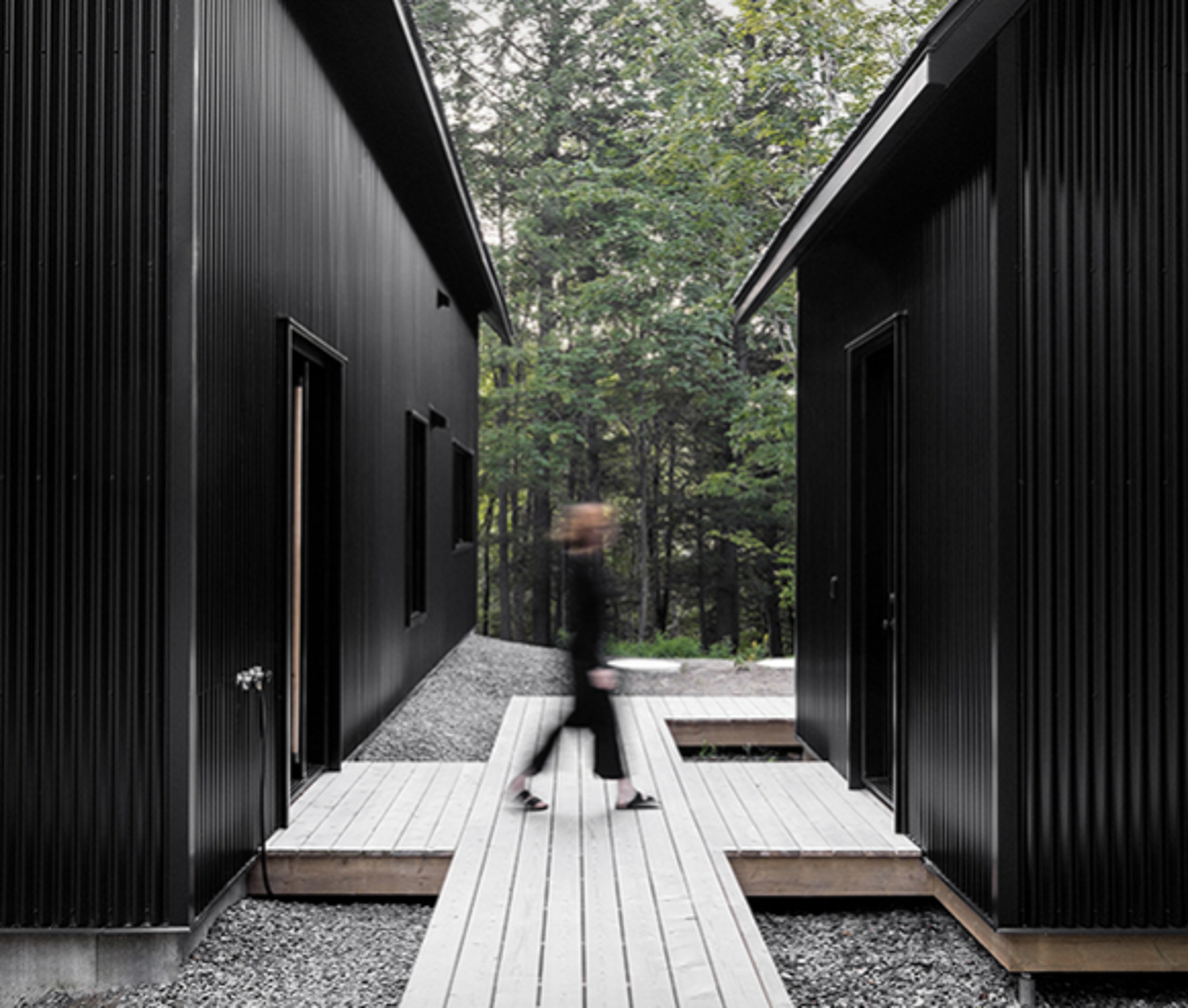 This minimalist [cabin](https://www.blessthisstuff.com/search/cabin) is located deep in the woods in Quebec, Canada, and was designed by Montreal-based practice [Appareil Architecture](http://www.appareilarchitecture.com/en). Designed to blend in with the surroundings the cabin was painted in black, accompanied with the white pine of the deck and the light gray of the gravel drive, matching the nearby aspens and the brownish-grey of the pines. In contrast to the black exterior, the interior spaces are bright and spacious with a restrained palette of plywood, white panelling and black features. The simple furniture ions stay true to the clean aesthetic and provide a sense of comfort and functionality to the residents. Made up of two buildings, the main house and accompanying cabin are linked by an outdoor deck, and huge windows give a preview of the minimalist interiors, and provide uninterrupted views of the dense green surrounds.