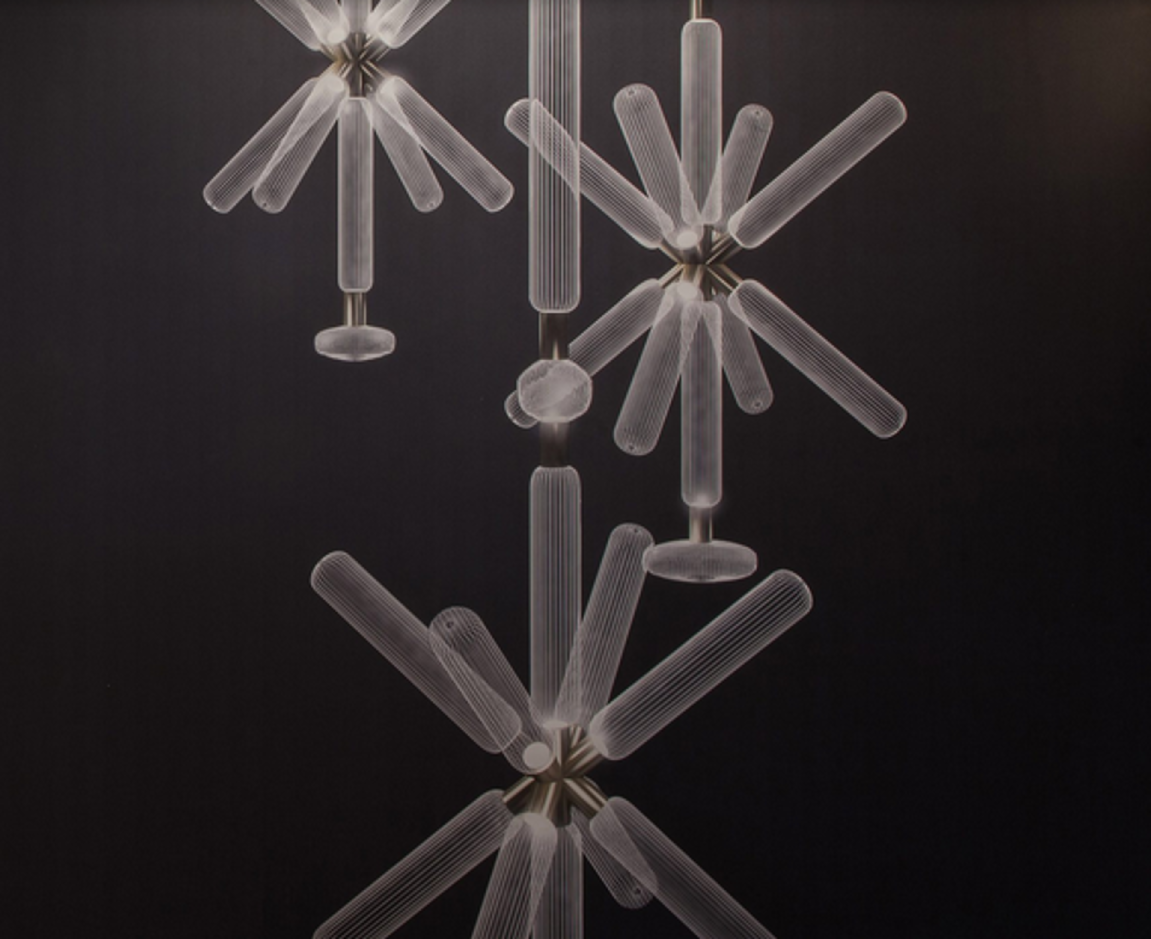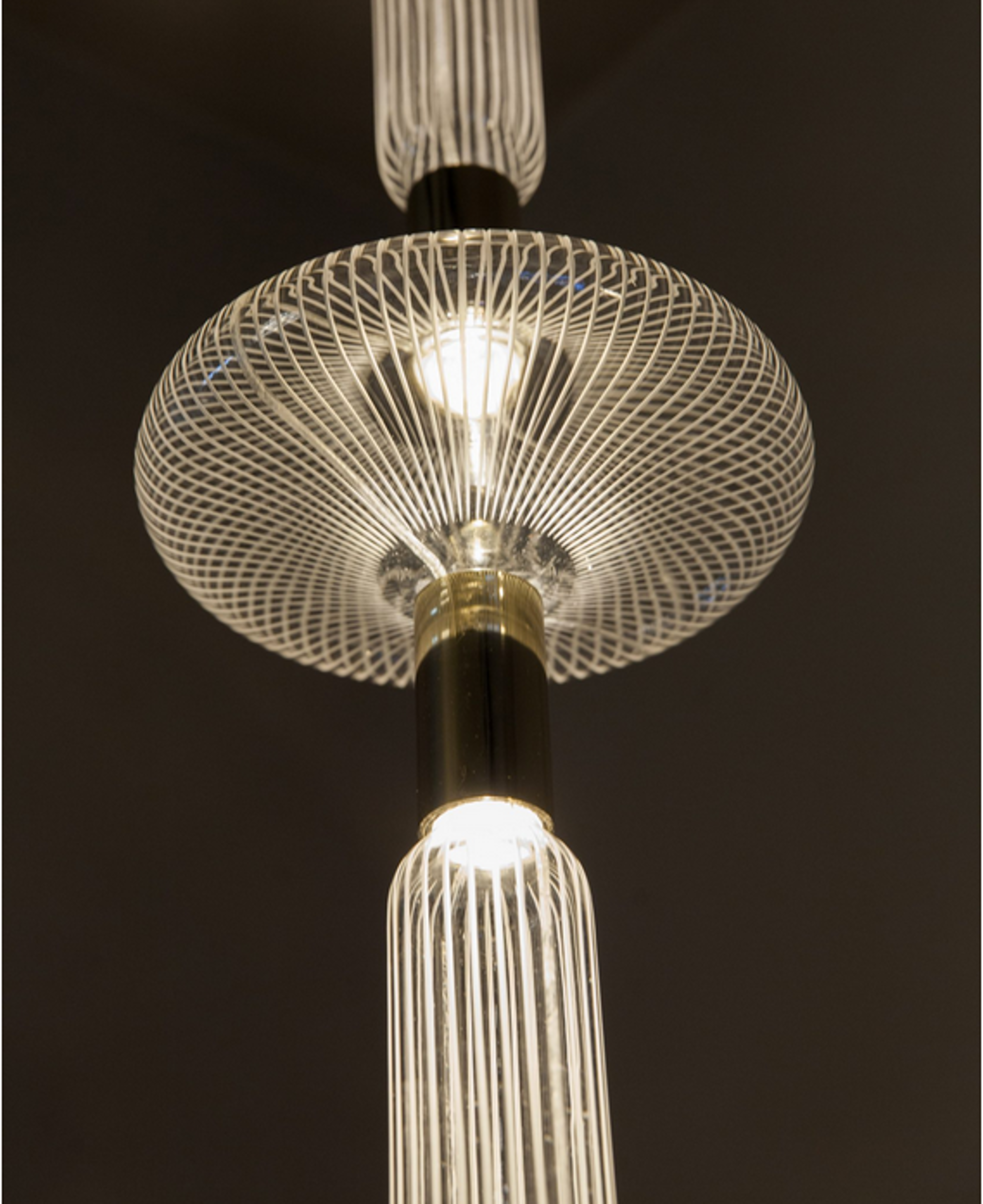 [Yabu Pushelberg](http://yabupushelberg.com/) joined forces with [Lasvit](http://lasvit.com/) to create the slender cylindrical lights, shaped like sunbursts and elongated capsules, to celebrate the traditions of handcraft. Each of the glass bulbs in the Cipher collection is handblown, and hand-etched with clean-cut vertical lines, by craftspeople in the Czech Republic. The individual crystal tubes erupt from champagne-gold polished brass fittings at the centre of the lights, casting shadows of their star-shaped forms across the room. Within the bulbs, light glows around the etched lines of the glassware, creating luminescent silhouettes.