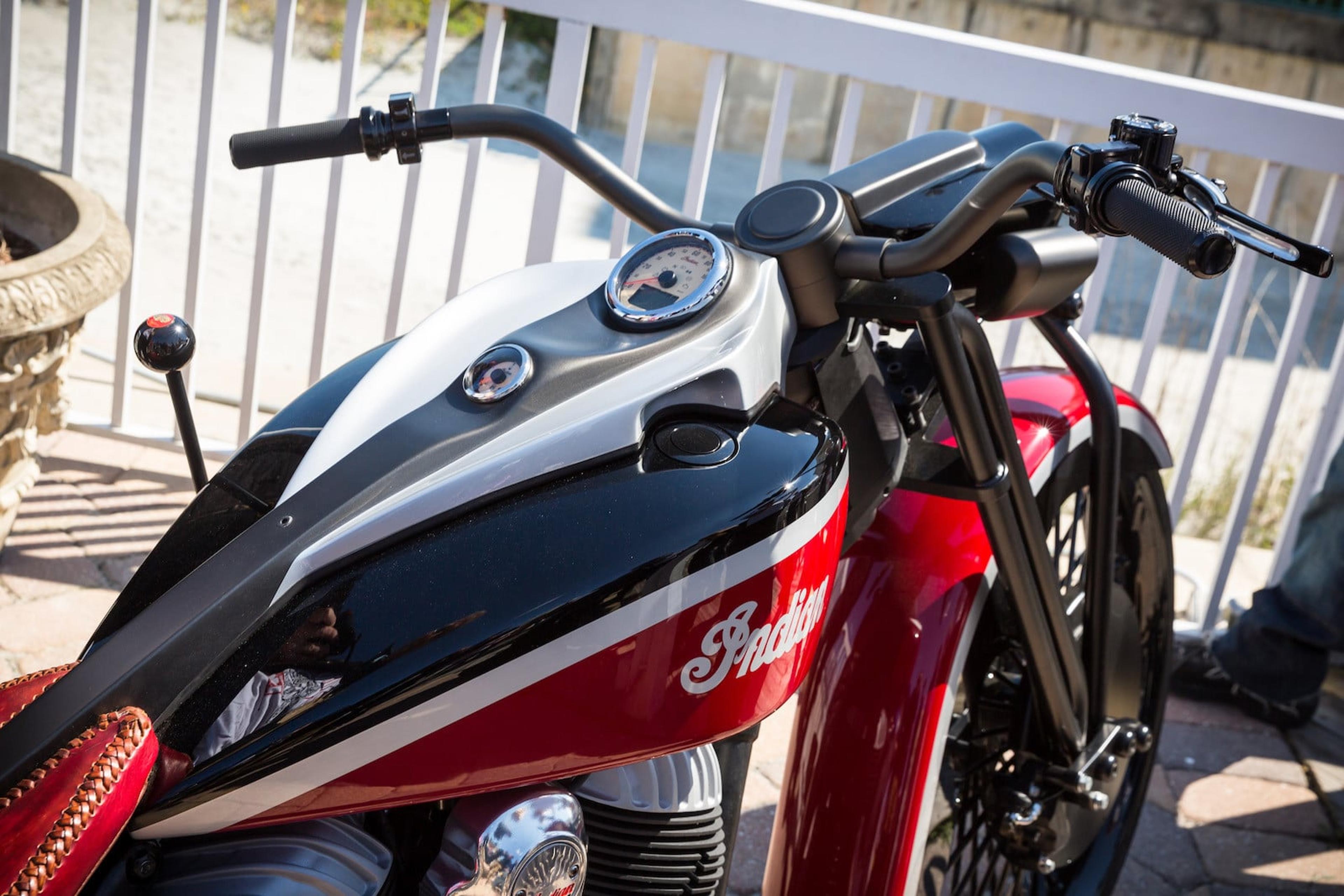 The springer front end wraps its arms around a 26-inch front wheel, embracing what looks similar to a vintage hub. Instead, the Springfield’s dual discs are covered to achieve the effect. The rear suspension has an air adjustable shock to keep the bags low to the ground when parked but allow them to be jacked up to a more street-reasonable height for riding.
