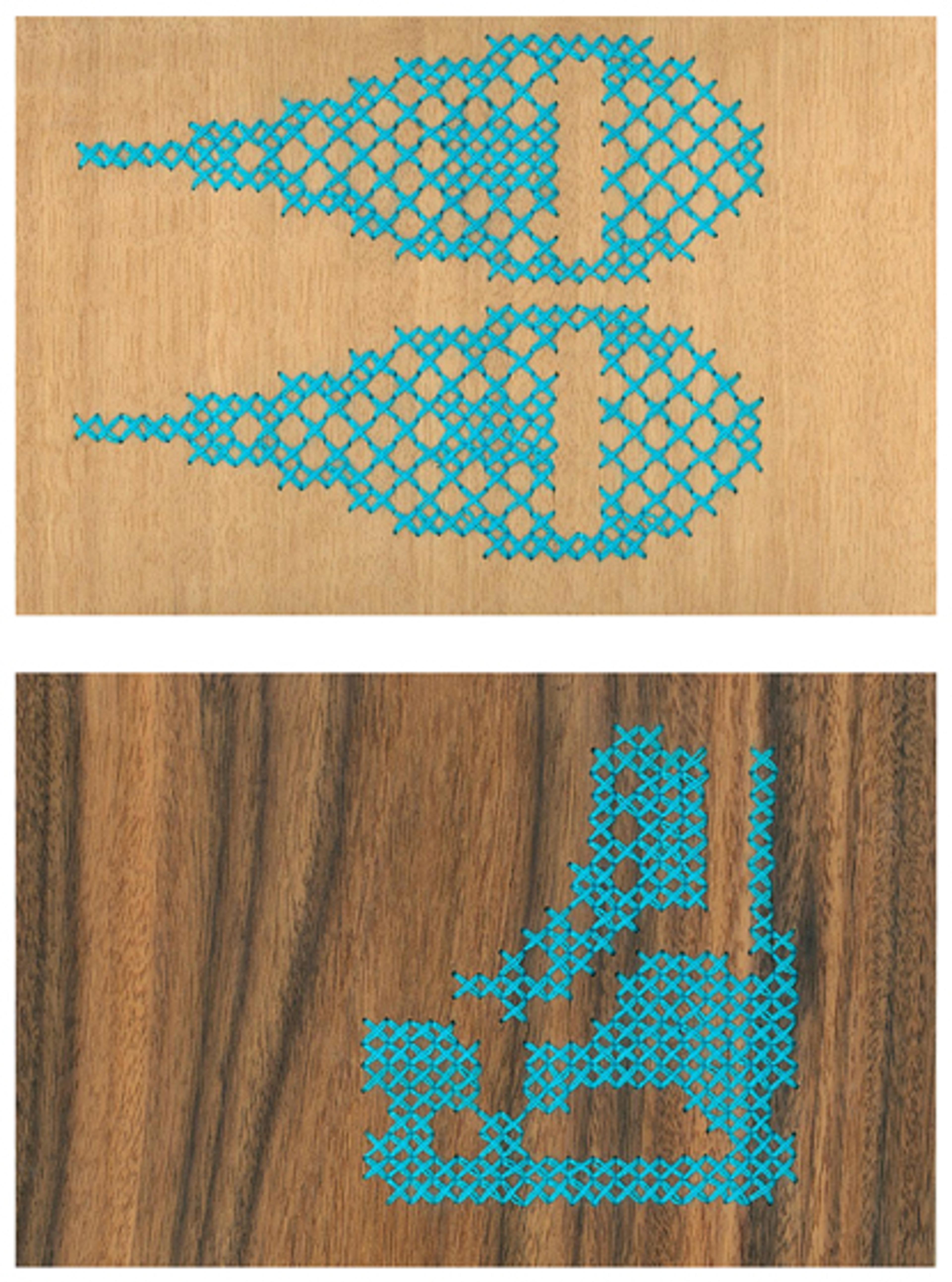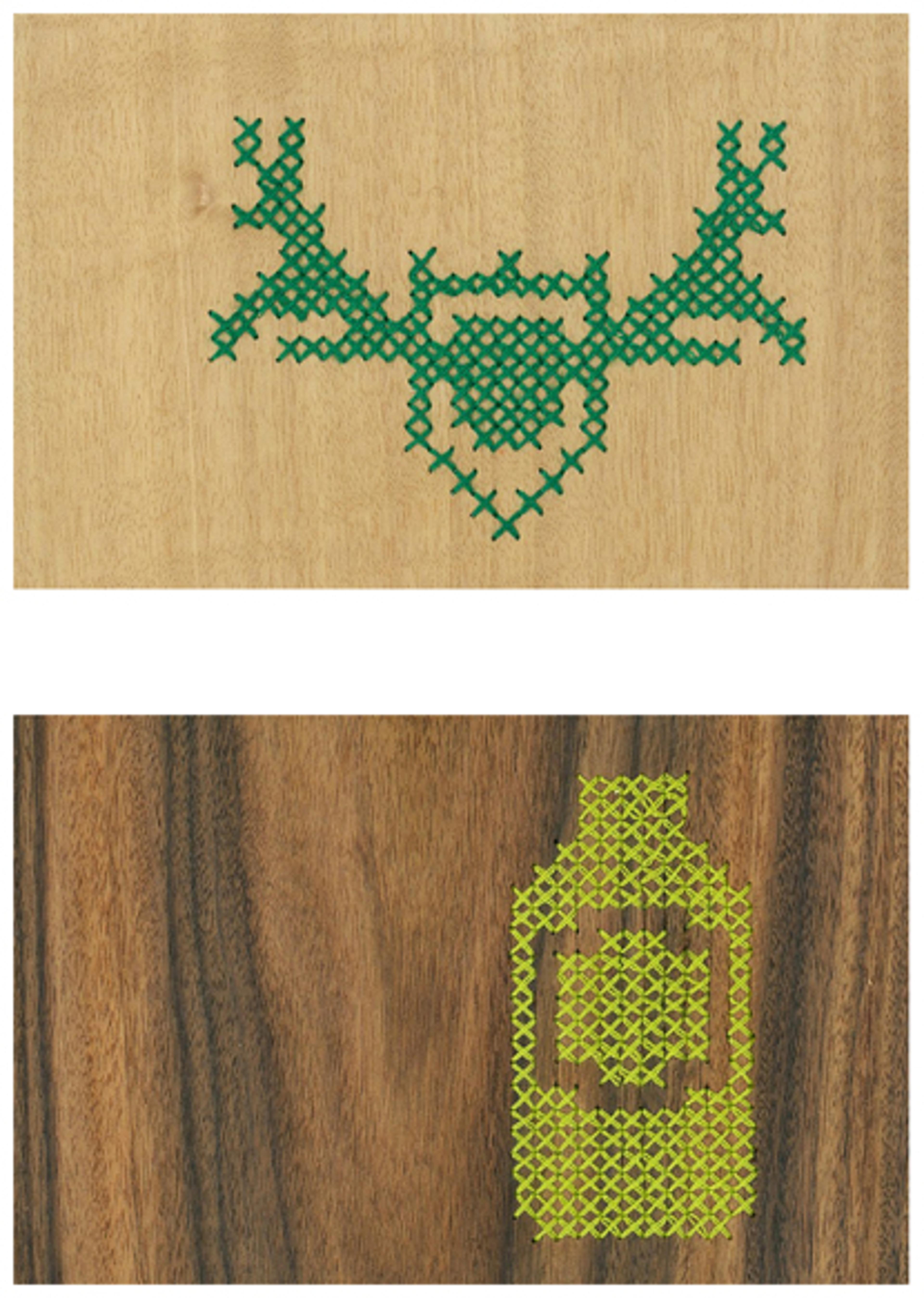Milks is an artist and designer working in Toronto. She has always had an interest in traditional domestic arts like knitting and cross-stitching and in the more recent craftivism movements. The dominating factor in most of her work is creating contrast or paradoxes by blurring the lines between art and design and mixing unlikely materials or methods like embroidery on wood as in the case with these postcards.