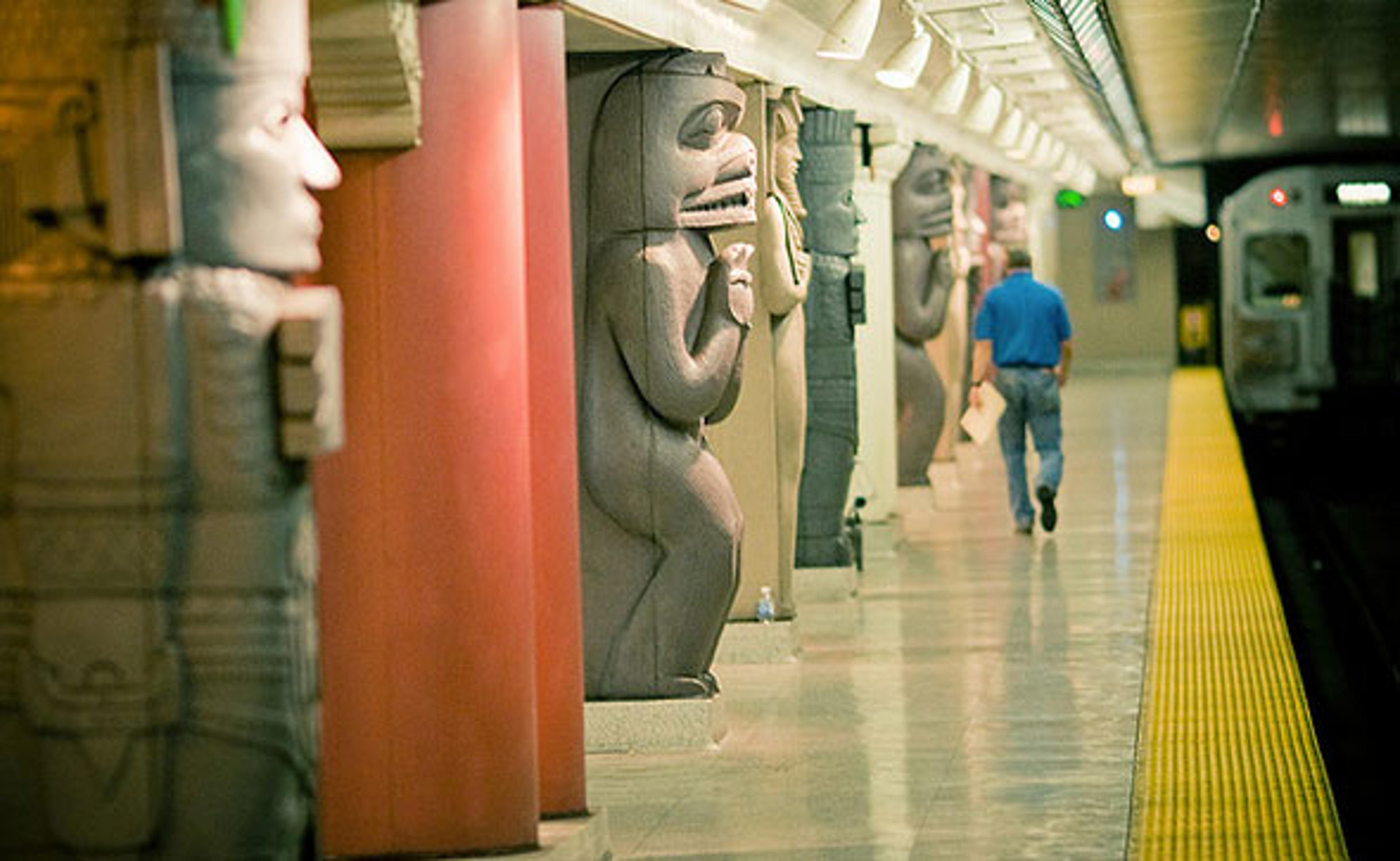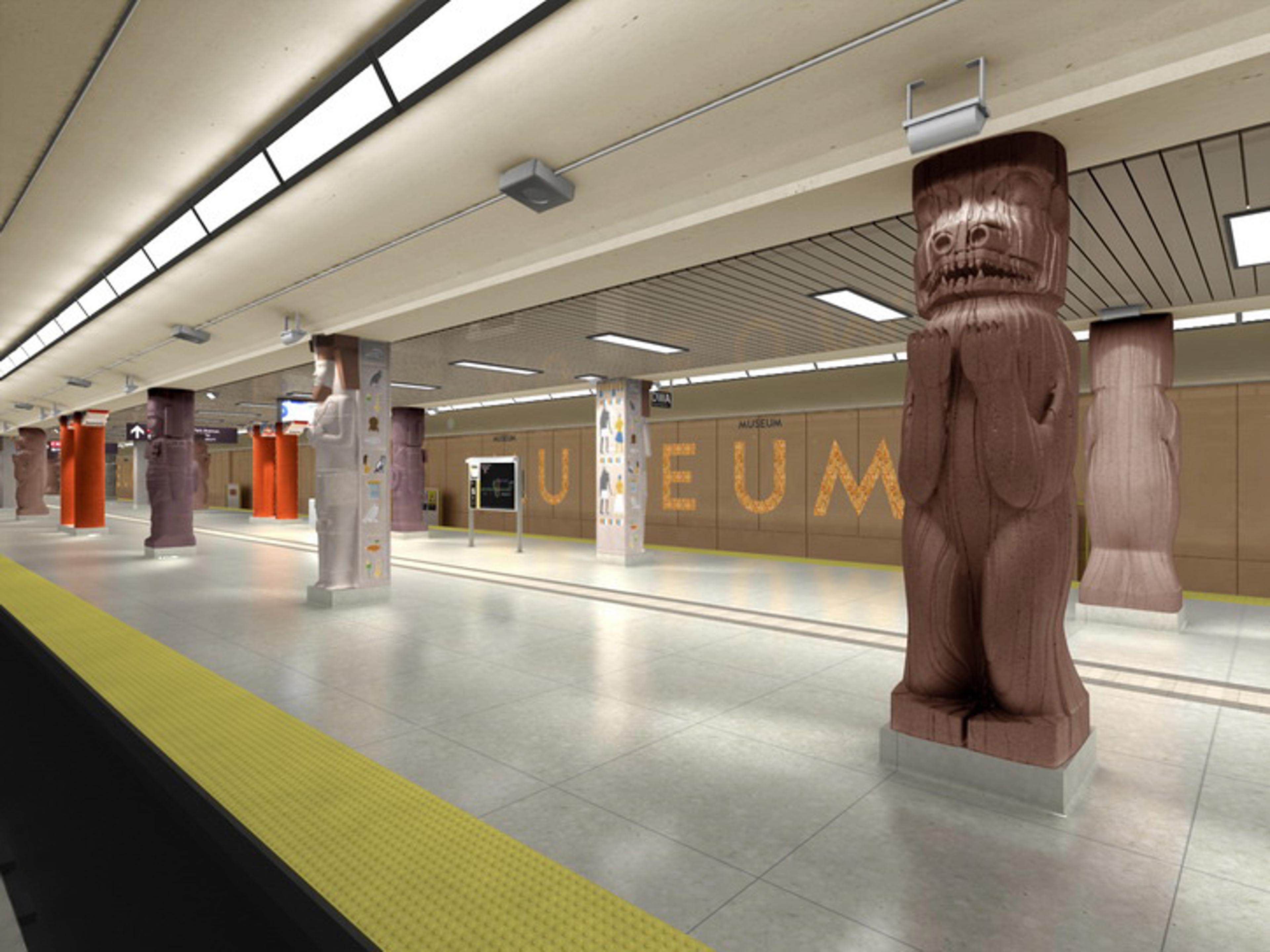 While most of the subways stations in Toronto are old school, a little boring and traditional, the recently remodeled Museum station stands out. Acting as an invitation to the ROM and Gardiner museums sitting above ground, right out the exists of the subway, the tunnel covered the existing station architecture with simple columns with fiberglass replicas of the museum’s collection, including Egyptian sarcophaguses, First Nation totem poles and Mayan statues, with a custom signage of the station name with a faux hieroglyphics pattern behind. Diamond and Schmitt Architects also worked to streamline the way-finding and other signage in the 45-year-old station, includes re-designing Designated Waiting Areas, the benches, and the dropped ceiling was removed to give a greater sense of volume, and new lighting to highlight.